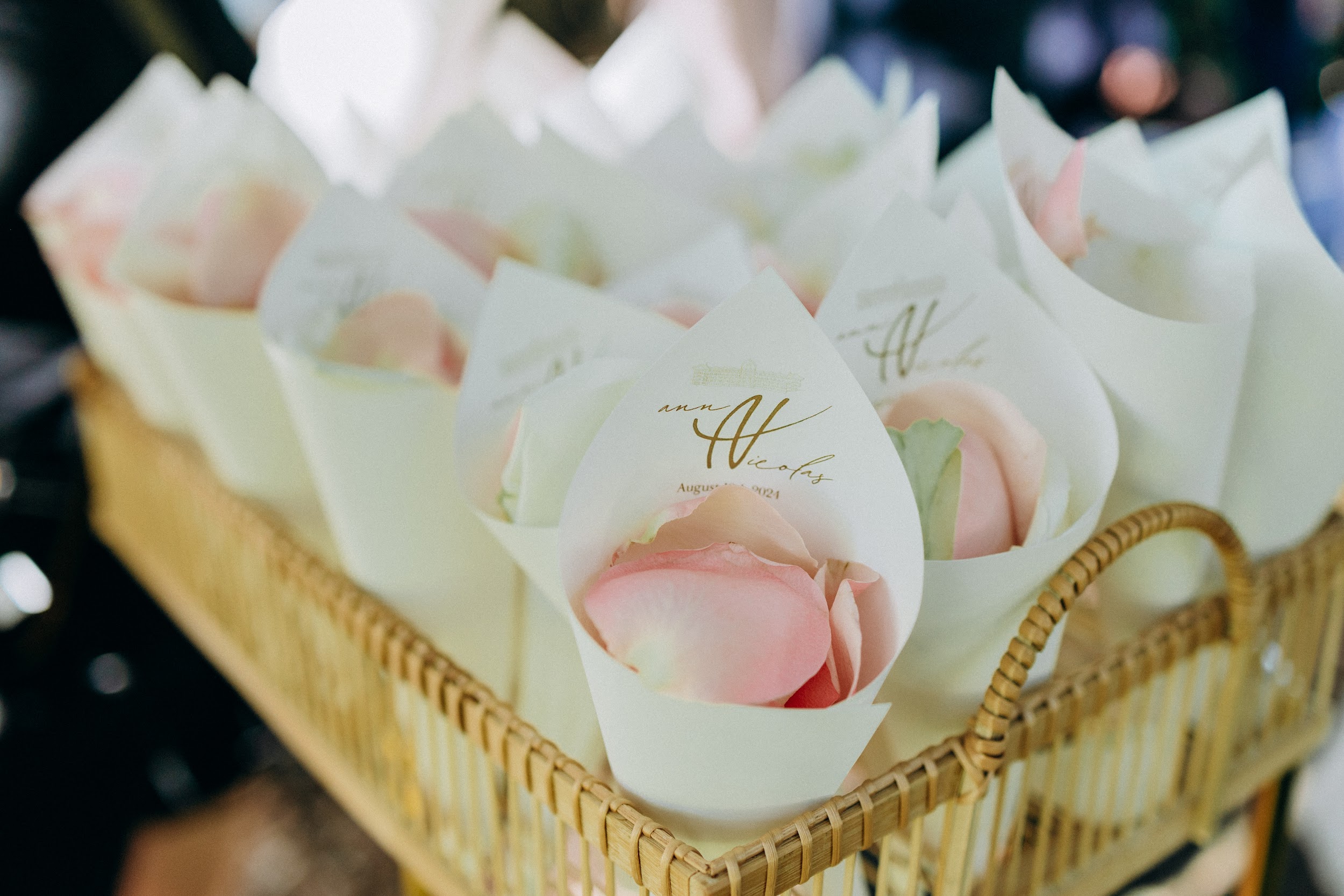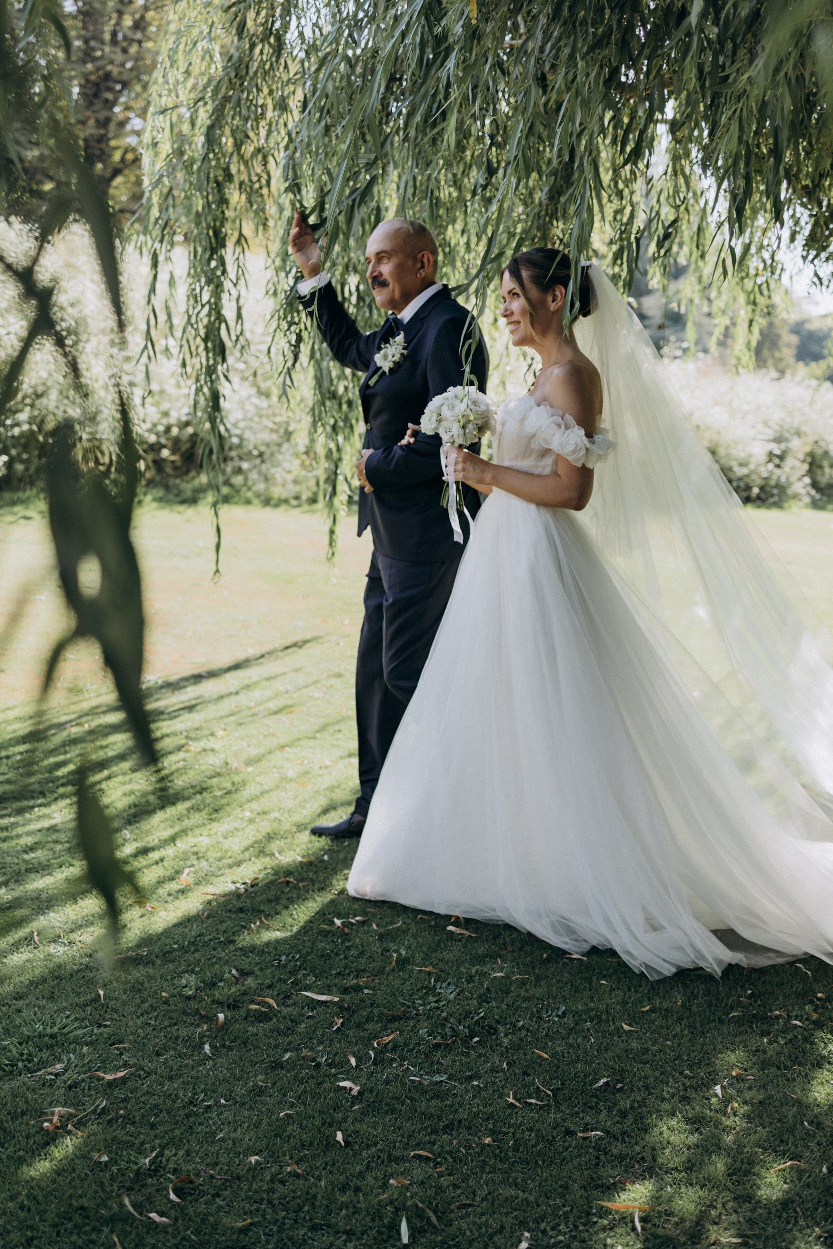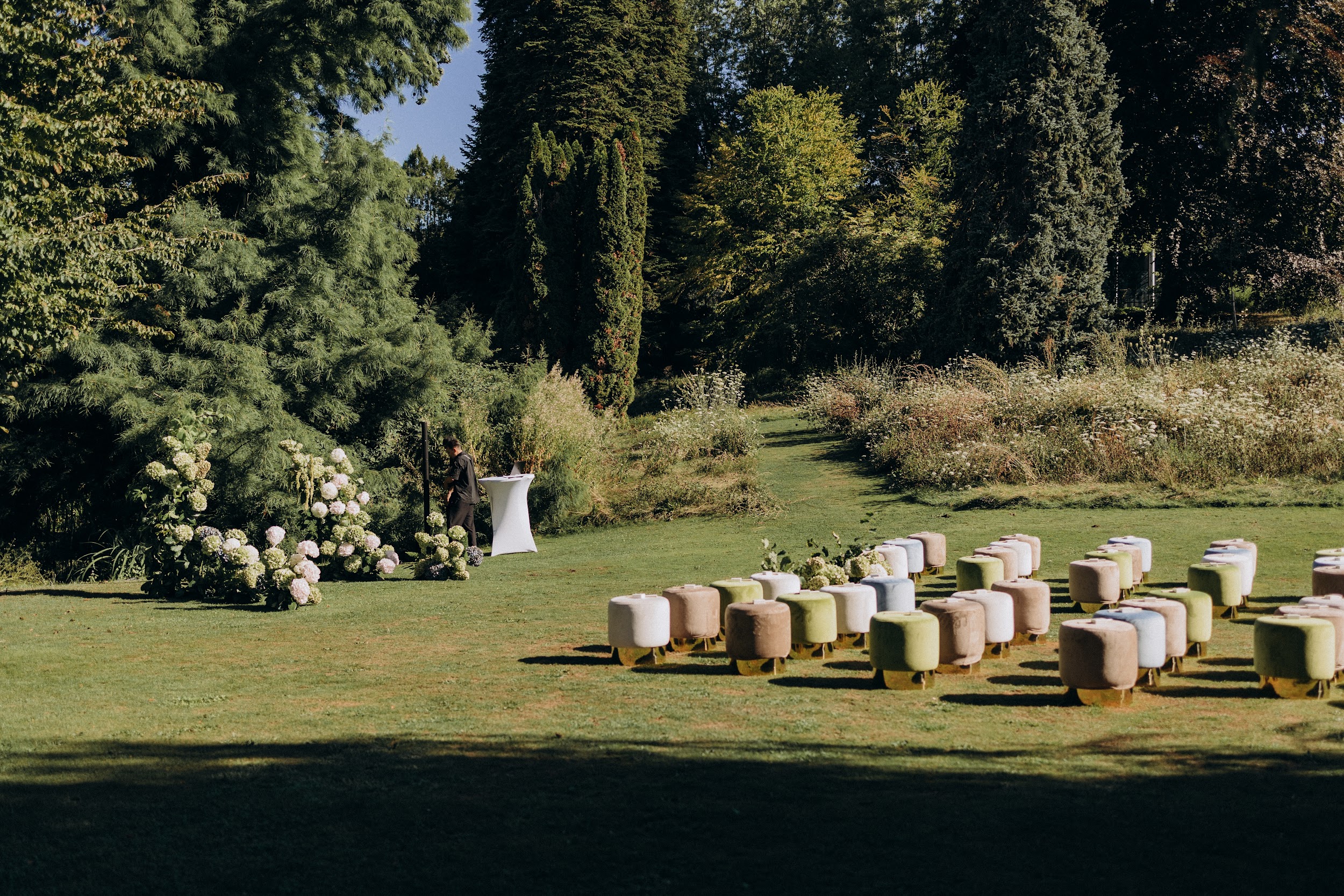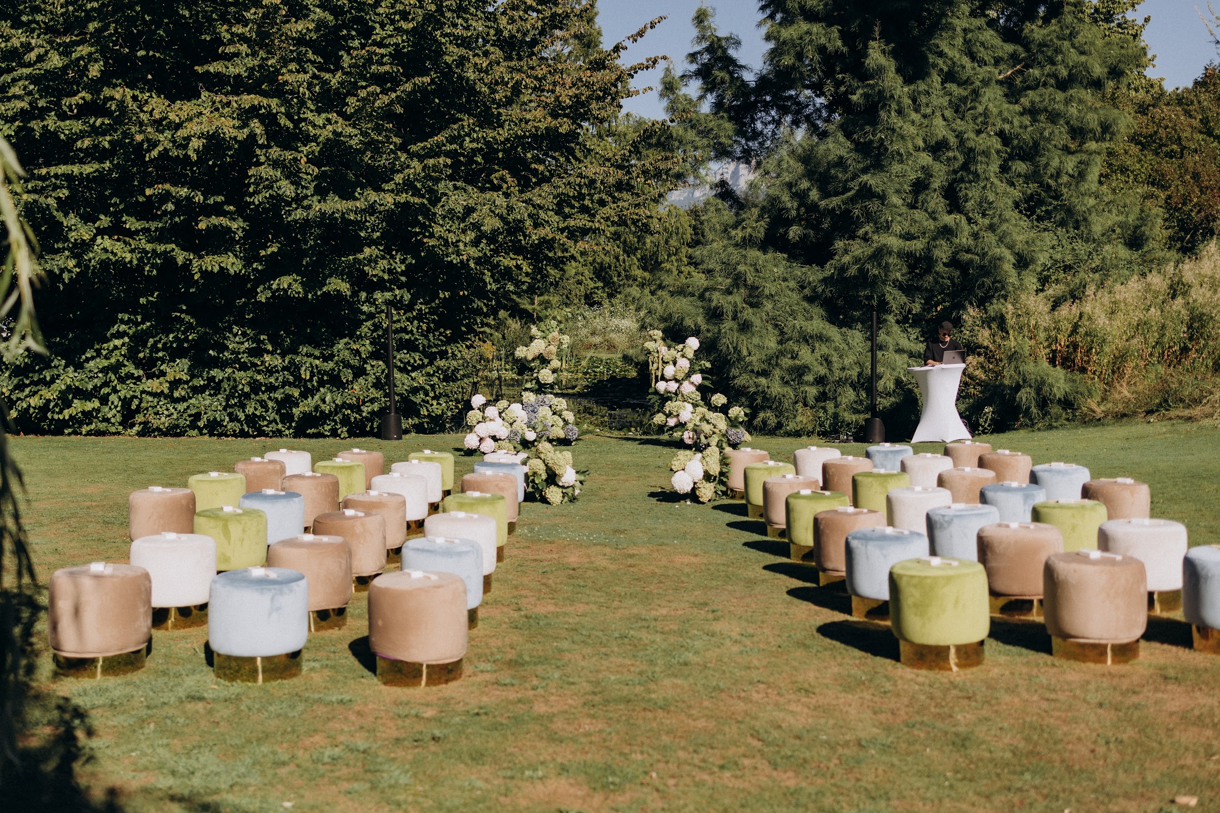 We dreamt of creating a ceremony with poufs instead of classic chairs and Anna & Nicolas trusted us on this decision. Playing with soft colors and greenery in this magestic natural garden of hotel Royal was our absolute favourite!