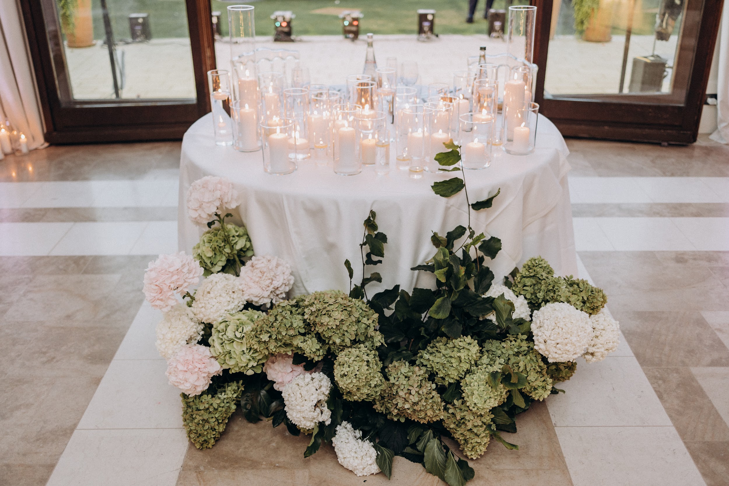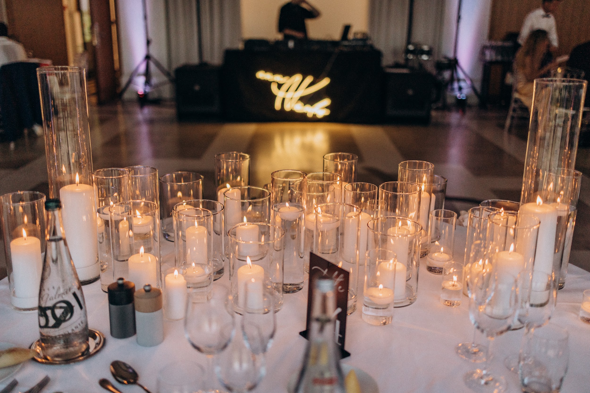 Reception room already had some really powerful color accents, so we decided to stay with our green tones and add mirrors and candles to enlarge and enlight the space. Over 400 vases with candles have been placed total of 7 tables!