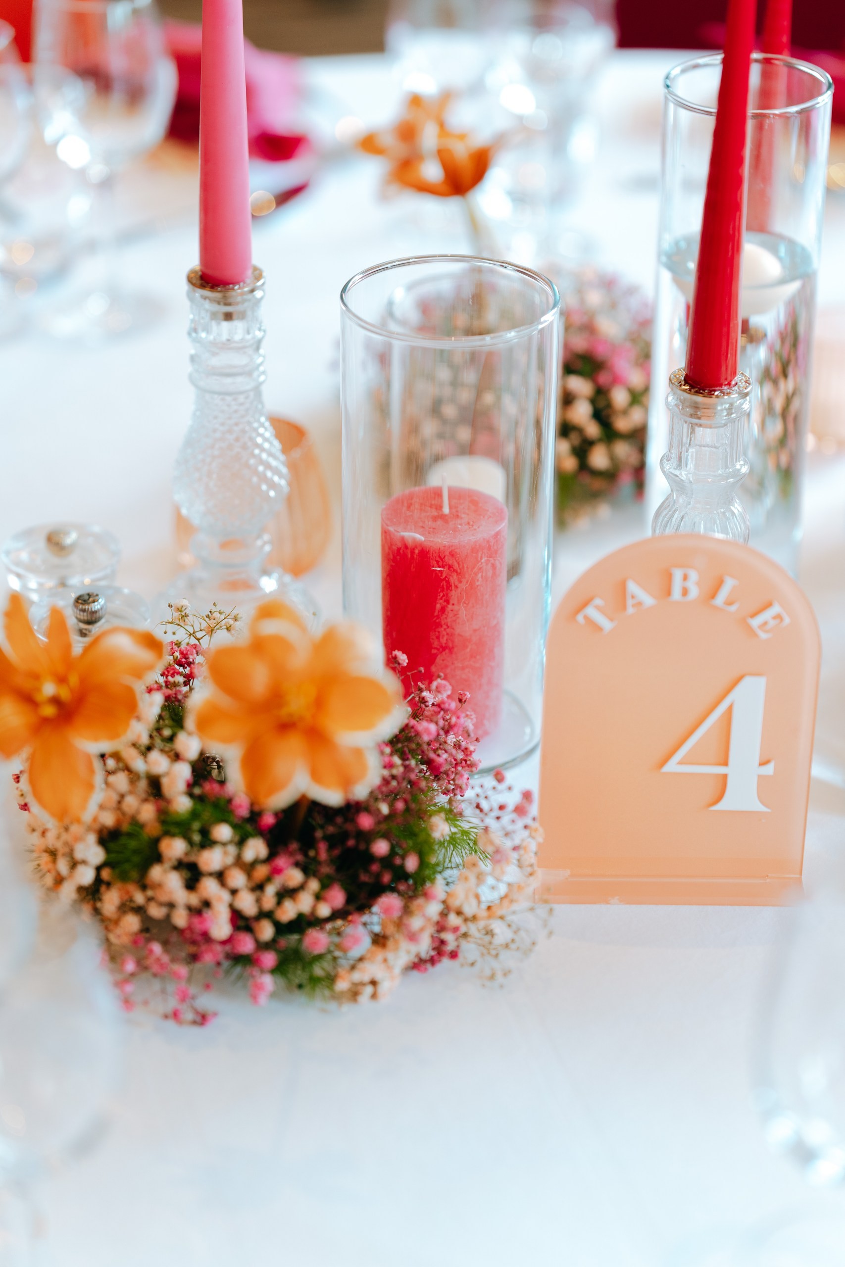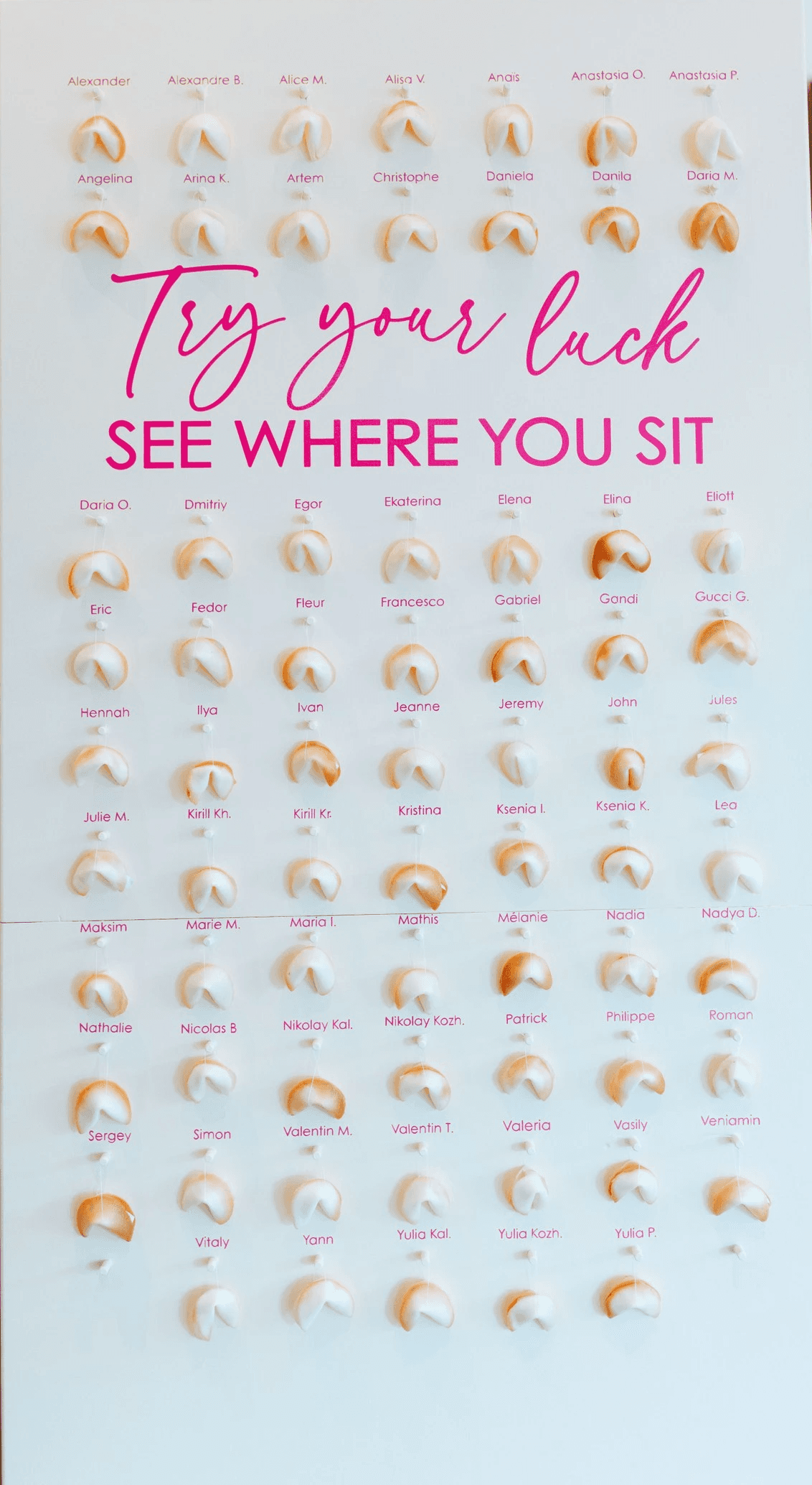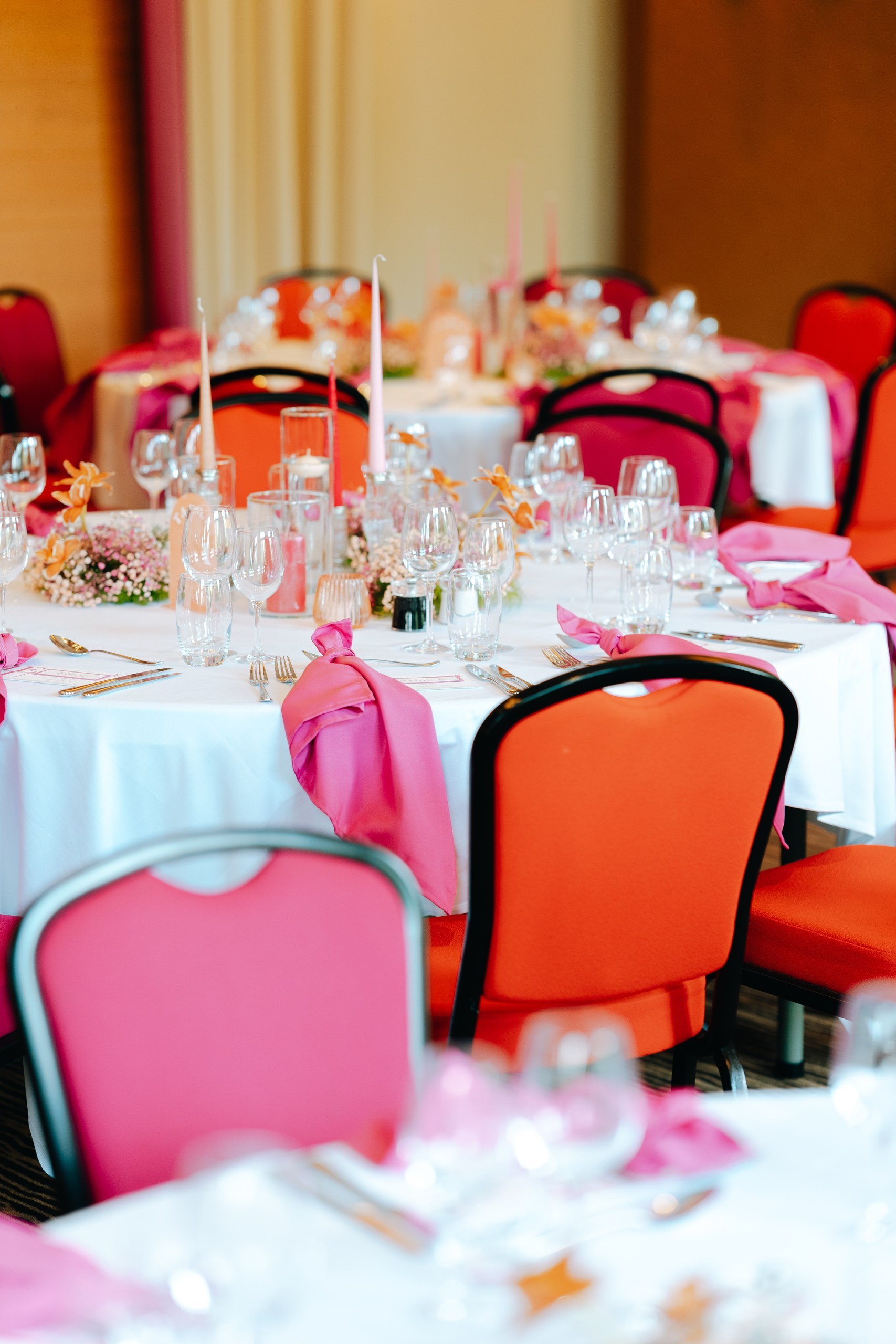 Instead of working against the room with already many bright colors - we decided to embrace it and go with the color scheme of fucchsia and coral colors! Fresh idea back then - the seating plan with fortune cookies, yummy!
